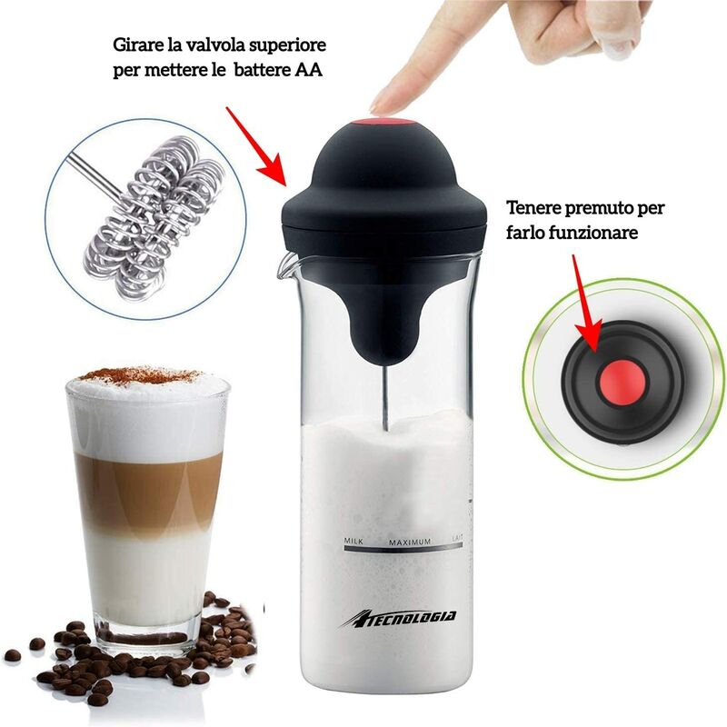 Montalatte, montalatte per cappuccini, latte macchiato e tante altre bevande in pochi secondi Sbattitore a doppia vite per una schiuma ricca! Progettato per un uso intuitivo e viene fornito con un contenitore di vetro per evitare fuoriuscite durante l'uso Comodo È alimentato da 2 batterie AA (non incluse), assicurando che la batteria sia completamente carica< /p> Versare il latte caldo a 60 gradi e inclinare leggermente il montalatte mentre si monta per ottenere risultati ideali.