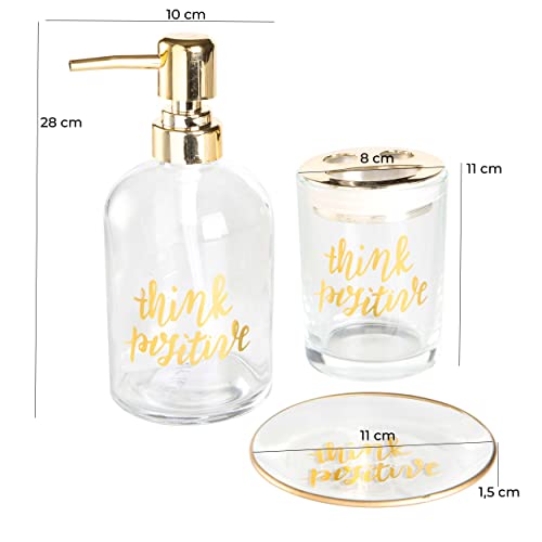 MONTEMAGGI Set Bagno 3 Pezzi in Vetro Trasparente con Scritte Oro e Dettagli in Metallo Dorato