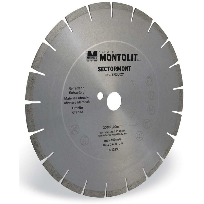 DISCO DIAMANTATO 400 MM MONTOLIT SECTORMONT SR40028 PER REFRATTARIO MATERIALI ABRASIVI GRANITO PORFIDO Dischi diamantati a settori saldobrasati Utilizzo: ad acqua Materiali: refrattario, materiali abrasivi, granito Applicazioni: lavorazioni e posa di materiali abrasivi, granito Prestazioni: Velocità: elevata Finitura: media Durata: elevata Attrezzatura: taglierina a banco Utensile ravvivabile con pietra diamantata art. 395B Diametro disco: 400 mm Foro disco: 30/25,4 mm Spessore disco: 3,5 mm