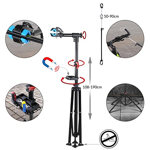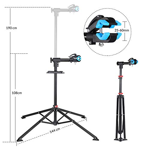 PRATICO: l'asta telescopica aggancio rapido e asta di fissaggio mantiene la bicicletta in sospensione. In questo modo avrete un accesso rapido e comodo alle parti della bici che desiderate riparare o sostituire. Il rivestimento in gomma protegge la bicicletta da eventuali graffi: adatto per telai da 25-40 mm.
