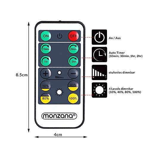 TELECOMANDO: tramite il telecomando è possibile regolare individualmente i livelli di luminosità (10/40/80/100%) dell'apparecchio a spina in base alle proprie esigenze. Inoltre, é presente un timer programmabile 10min/30min/1h/2h.