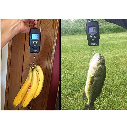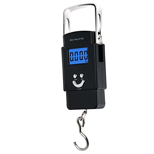 Moobom, Nastro da 1 m, Bilancia Elettronica da 50 kg, Display LCD, retroilluminato, Gancio Postale per Pesca Bagagli, 2 batterie AAA Incluse