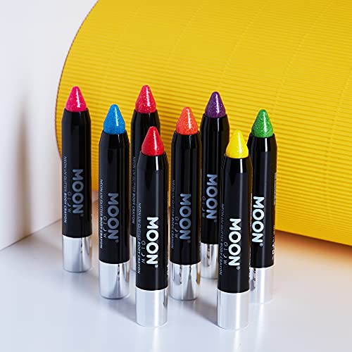 PASTELLI PER CORPO MOON GLOW NEON UV GLITTER - Pastelli per corpo premium neon glitter con il divertimento aggiunto della magia fluorescente. Gli 8 colori intensi e sfarzosi brillano al neon di giorno ed emettono un bagliore incredibile sotto l'illuminazione UV e le luci nere: fantastico!