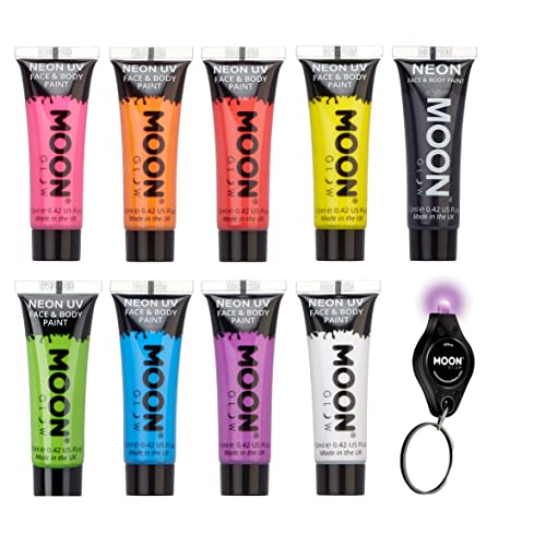 Moon Glow Vernice UV intensa per viso e corpo al neon - include portachiavi UV, Rosa, arancione, giallo, verde, blu, viola, rosso, bianco, nero, 12 ml (confezione da 9)