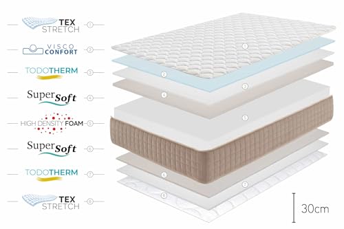 La composizione di questo materasso comprende un sistema multistrato di 6 cm di spessore composto da viscoelastico in gel, schiuma SuperSoft e fibre naturali BIOTHERM