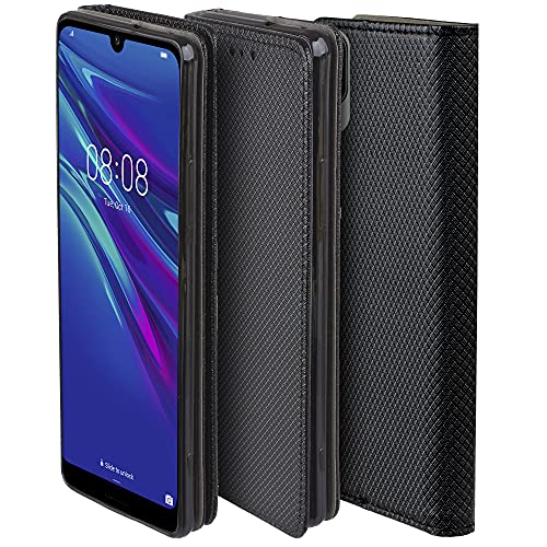 Moozy Cover per Huawei Y6 2019, Nero - Custodia a Libro Flip Smart Magnetica con Appoggio e Porta Carte