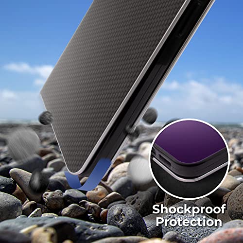 Moozy Custodia a Libro per iPhone 13 Pro Max, Carbonio Nera - Protezione dei Bordi Metallici Flip Cover Portafoglio con Appoggio e Porta Carte