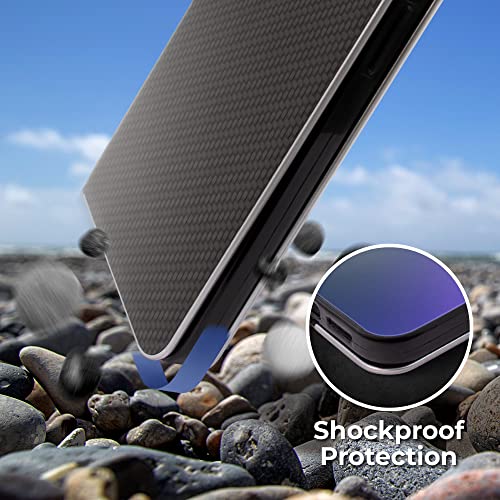 Moozy Custodia a Libro per iPhone 13, Carbonio Nera - Protezione dei Bordi Metallici Flip Cover Portafoglio con Appoggio e Porta Carte