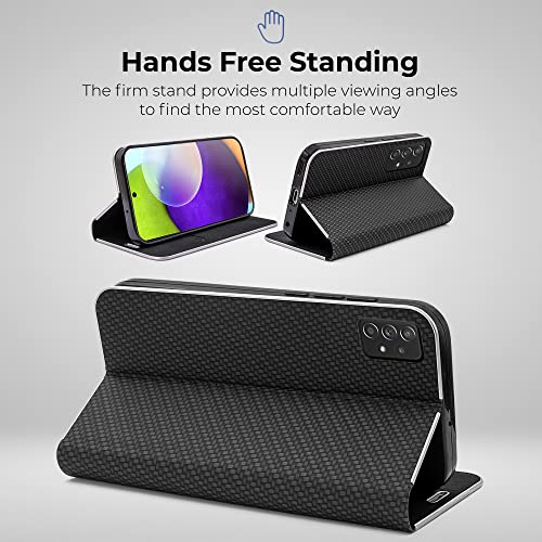 Moozy Custodia a Libro per Samsung A52s 5G e Samsung A52, Carbonio Nera - Protezione dei Bordi Metallici Flip Cover Portafoglio con Appoggio e Porta Carte