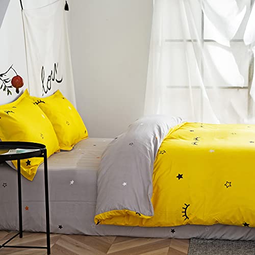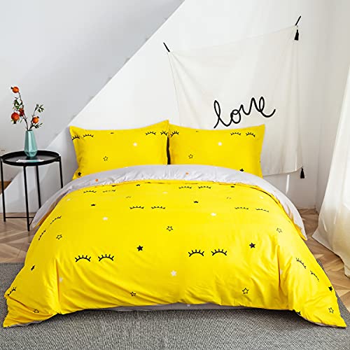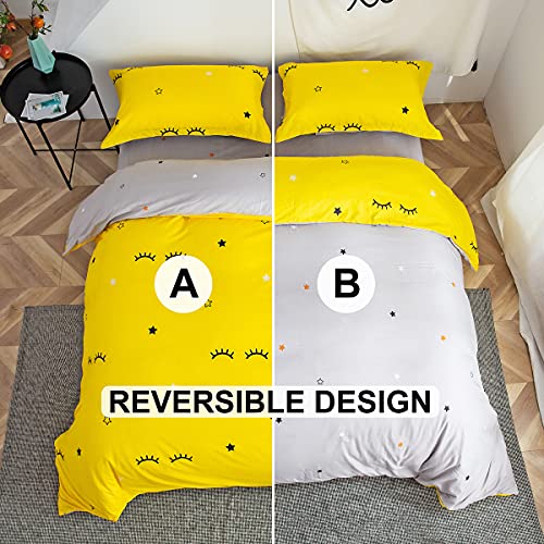 Morbuy Set Copripiumino Una Piazza e Mezza 200 x 200cm e 2 Federe, Sacco Copripiumino Reversibile Ragazza in Microfibra con Motivo di Ciglia e Stelle, Copri Piumone Traspirante, Giallo e Grigio