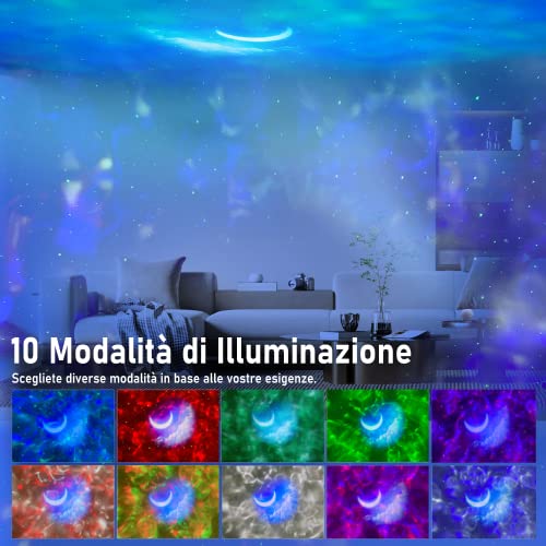 Proiettore Cielo Stellato a Led - 4 colori base (blu, rosso, verde, bianco) e 6 colori misti, più stelle, luna e nuvole possono essere combinate in diverse modalità di illuminazione. Lascia che tu e la tua famiglia vi godiate un cielo stellato diverso ogni notte.