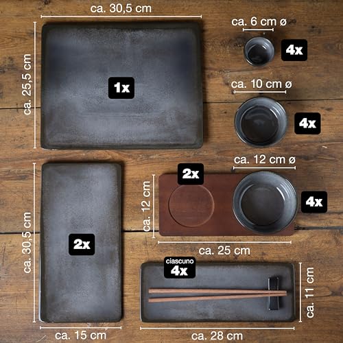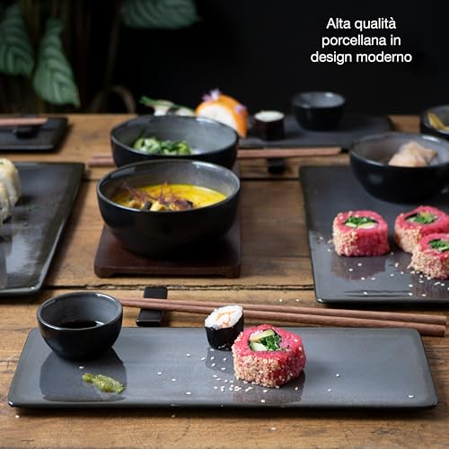 SET COMPLETO - Set sushi piatti per sushi Moritz & Moritz nero-grigio-blu per 4 persone: con 4 paia di bacchette, 4 porta bacchette, 4 ciotoline per salse, 4 ciotole da immersione per zenzero e wasabi, 4 ciotole per miso, 1 piatto grande da portata per sushi, 2 piatti piccoli da portata per sushi e 4 piatti da sushi
