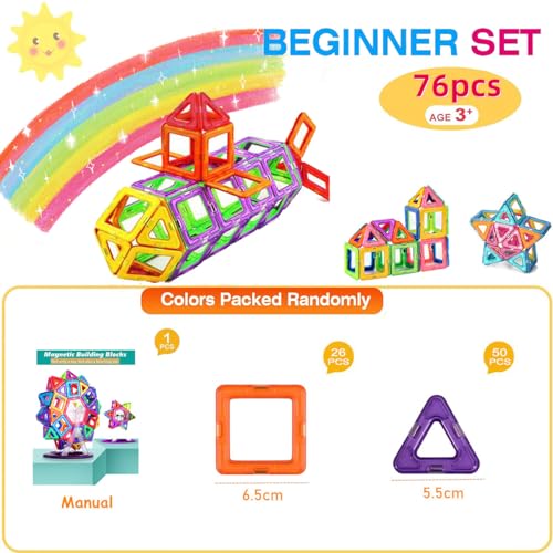 Blocchi magnetici di alta qualità e convenienti: 76 pezzi in totale, di cui 50x triangolo, 26x quadrato, 1x opuscolo. 2 diversi colori casuali su ogni lato di ogni mattoncino magnetico. Più pezzi nella confezione a un prezzo inferiore. Compatibile con altre tessere di dimensioni simili.