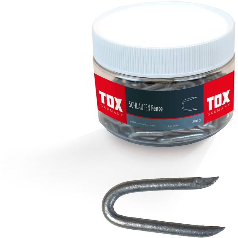 I passanti per fili TOX Fence sono realizzati in acciaio zincato a caldo e sono ideali per fissare fili di tensione e reti al legno, anche in aree esterne non protette. I punti metallici a forma di U hanno punte affilate e ricurve per facilitare l'inserimento. Gli occhielli per chiodi sono disponibili in diverse dimensioni. Fissaggio di filo spinato, rete metallica, recinzioni metalliche, griglie metalliche ma anche zanzariere, reti a traliccio e reti di protezione Zincato a caldo per una buona protezione dalla corrosione Facile da usare grazie alle punte affilate e taglienti Conservazione nel pratico barattolo rotondo Contenuto della fornitura: 1x barattolo rotondo, 1,6 x 16 mm, 1 barattolo, 400 g (830 pezzi). Gli anelli per chiodi TOX Fence sono forniti ordinati per tipo nella pratica scatola rotonda TOX: questo garantisce che tutto sia riposto in modo ordinato, possa essere trasportato in modo sicuro e sia rapidamente a portata di mano. I barattoli sono resistenti, proteggono dalla