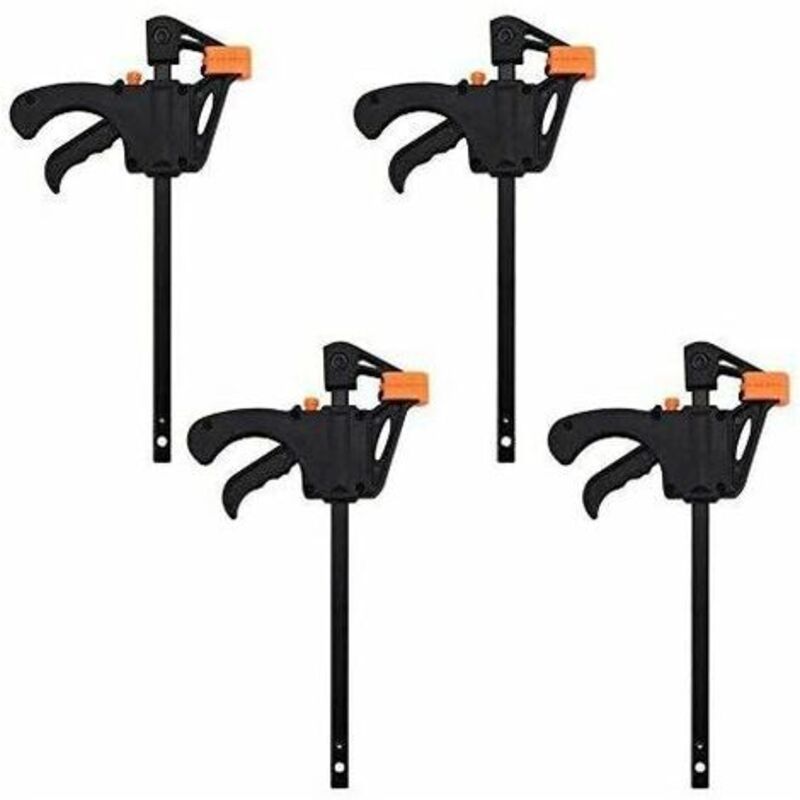 Distanza tra i morsetti - : la distanza massima tra i morsetti è di 10 cm. 【Veloce e ad alta efficienza】: l'impugnatura con grilletto a pressione è comoda da tenere in mano. Premere la leva di sgancio rapido per far scorrere il braccio alla lunghezza desiderata. 【Robusto e durevole】: realizzato in plastica e lega di alluminio, robusto e resistente. 【Facile da usare】: fai scorrere il braccio e tieni saldamente il legno. 【Applicazione】: ampiamente utilizzato nella produzione di mobili e nell'industria dell'imballaggio. Specifiche: Condizione: 100% nuovo di zecca Materiale: lega di alluminio + plastica Colore principale: nero Lunghezza: ca. 20 cm / 7,87 pollici Larghezza: ca. 11 cm / 4,33 pollici Distanza massima di serraggio: ca. 10 cm / 3,94 pollici Peso: ca. 300 g Contenuto della confezione: 4 morsetti in legno F