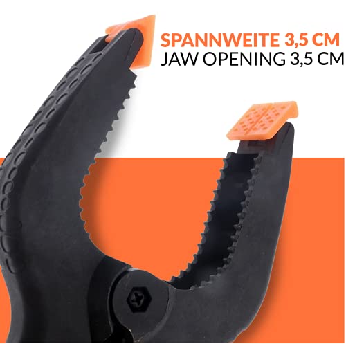 QUALITÀ PROFESSIONALE: 10 Morsetti a molla professionali con ganascia mobili e dentellate. Lunghezza: ca. 95-100 mm, ganasce 14 mm, larghezza di apertura: max. 35 mm, colore: nero.