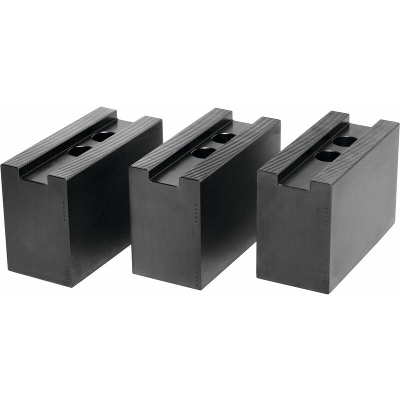 Scanalatura fresata di precisione e dentatura rettificata di precisione, esecuzione brunita. Materiale: Prodotto di qualità in 16MnCr5. Per: Mandrini autocentranti Schunk, Röhm e altre marche. Accessori speciali: Tasselli n. art. 313505 − 313605. Nota: * Per l'adattamento al mandrino autocentrante, si prega di controllare tipo di dentatura, larghezza scanalatura (D) e distanza dei fori (a, b). * Morsetti in alluminio, su richiesta. Dati tecnici Tipo di prodotto Ganasce per mandrini autocentranti a forte serraggio Altezza H, mm 60 Larghezza B, mm 40 Lunghezza L, mm 90 Distanza fori a, mm 25 Larghezza cava D, mm 17 Distanza fori b, mm 22 Per tipo mandrino, mm 210 Per filettatura DIN 912 M12