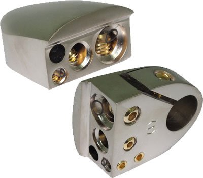 Morsetto batteria polo negativo nichel plated. Ingresso cavo da 50 mmq + 21 mmq + 8 mmq.