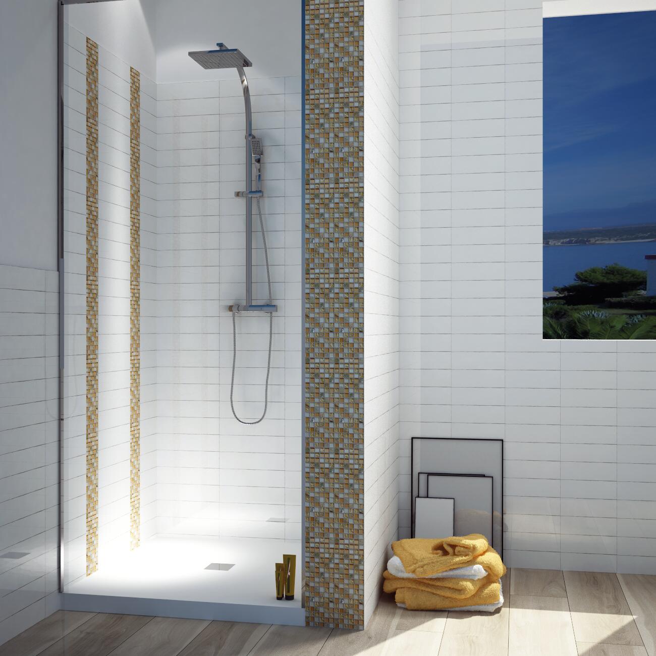 In vetro e pietra.. Ideale per posa a parete in ambienti interni alla casa, ma ottimo anche per creare listelli e/o inserti decorativi perché facile da tagliare. Si adatta a tutte le superfici sia dritte che ondulate. Mosaico ideale per la decorazione da interno, con effetto tenuamente metallizzato che crea un mutevole e gradevole gioco di luce e colori.. Lo spessore 8 mm è particolarmente indicato per essere posato in abbinamento con la maggior parte delle piastrelle