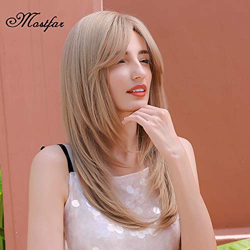 Mostfar - Parrucche lunghe e dritte bionde con frangia laterale, resistenti al calore, per donne, in costume di Halloween, feste in maschera, parrucca da 50 cm