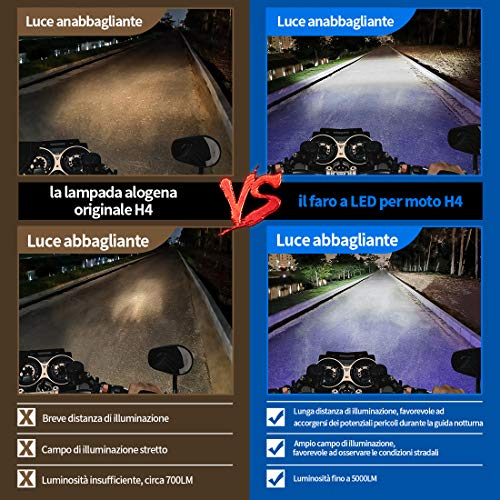 [Luminoso risparmio energetico] Il faro H4 moto adotta due chip CREE ad alta potenza da 30 W con luminosità fino a 6000 Lm. Rispetto alla tradizionale lampada alogene, la luminosità aumenta di oltre 3 volte e il consumo energetico è solo del 50% rispetto al consumo della motocicletta originale con il risultato di risparmio energia e protezione ambiente. Il tipo di luce per motocicletta a LED accoppia perfettamente con la lampada alogena della motocicletta originale senza astigmatismo