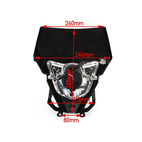 Compatibilità: ci sono kit di montaggio universale per la maggior parte delle bici enduro e supermoto. Dimensioni approssimative: altezza 31,8 cm, larghezza 30,5 cm. Tipo di lampadina: S2, 12 V, 35 W