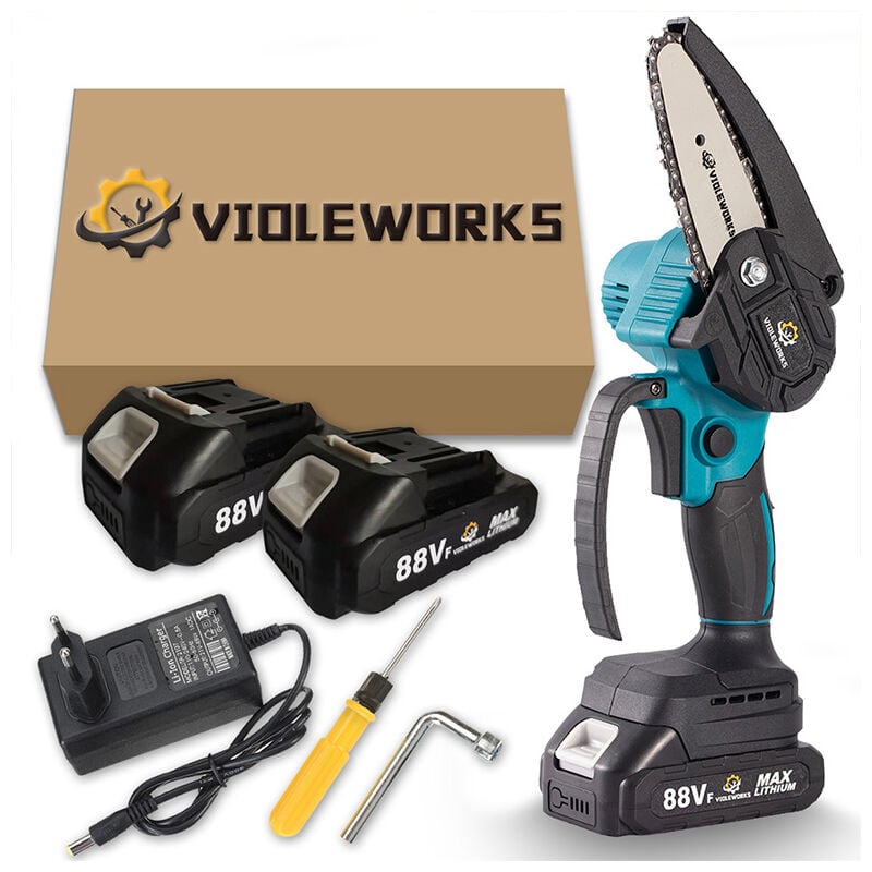 88VF Cordless Elettrosega Motoseghe a batteria ricaricabile Elettrico Sega senza fili + Display Batteria con 2 batterie NOTA: La catena non dovrebbe essere installata troppo strettamente all'inizio, altrimenti l'ingranaggio interno scivolerà e influenzerà l'uso del prodotto!!! Specifiche: Corpo adatto anche per la batteria Makita 100% nuovo di zecca con alta qualità Tensione: 88VF Potenza della batteria: 1200W Lunghezza della piastra di guida: 4 pollici Velocità della catena: 5M/S Dimensione di taglio: <100 mm Batteria: 6000 mAh Azionamento elettrico: Forte motore a magnete Catena: Regolazione rapida Materiale: Metallo catena d'acciaio Caratteristiche: - Pratico, velocità veloce, basso consumo energetico. - Motore in rame puro, forte potenza, taglio veloce, migliorare l'efficienza. - Interruttore di qualità fine, regolazione veloce e lenta, cambio di velocità stepless. - Catena della piastra di guida di qualità fine, tempra profonda, più resistente all'usura, taglio liscio. - Sega a