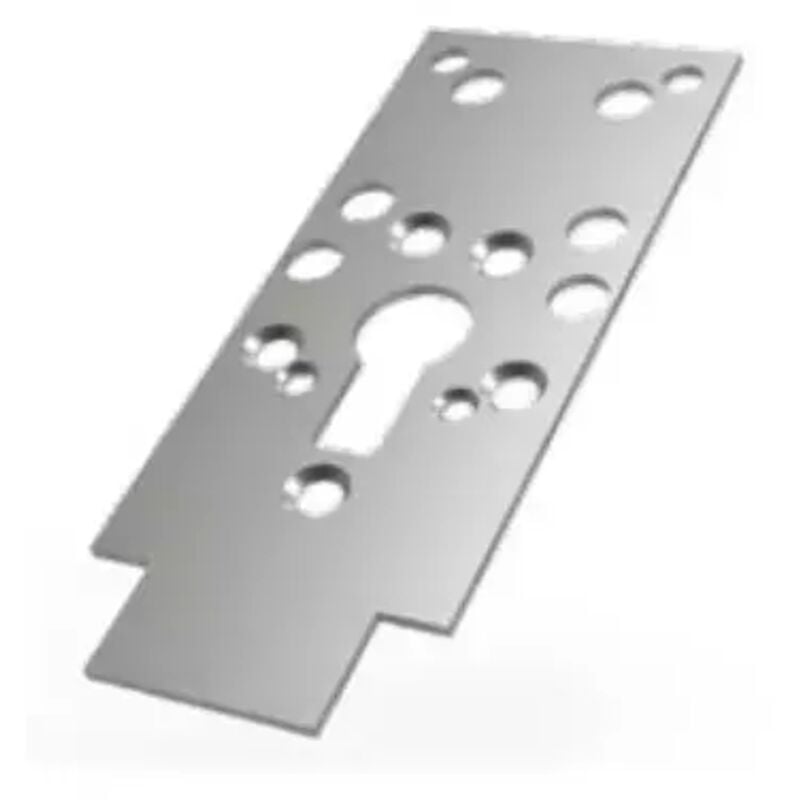 Piastra di fissaggio per la posa del ferroglietto 38.328. La piastra è ambidesta. Permette di fissare un Defender con l'utilizzo di viti a testa svasata. Dimensioni mm 135x54x2.