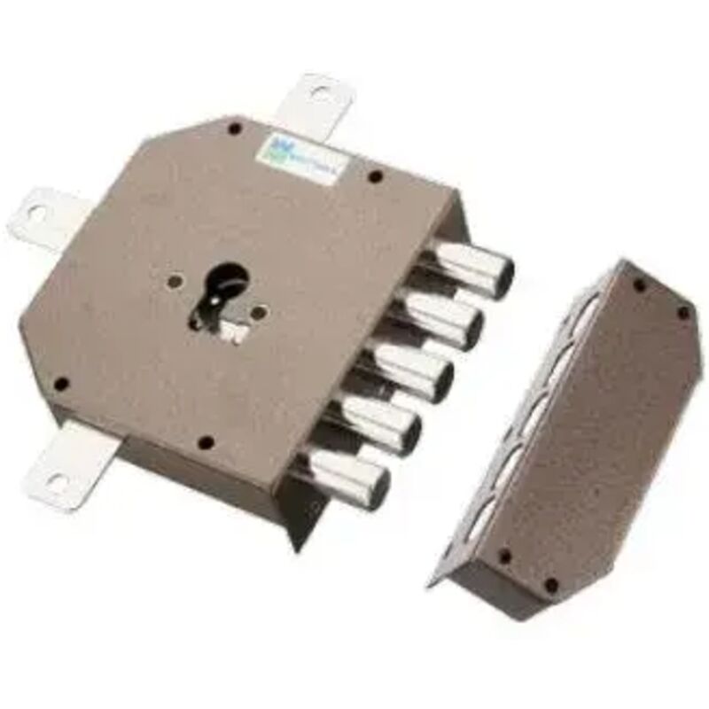 Mottura serratura legno applicare 38640 Mano sinistra Chiave a cilindro sagomato (non incluso) in acciaio verniciato Mottura serratura legno applicare 38640 Per cilindro sagomato. Chiusura quintuplice con catenaccio a 5 pistoni e 2 mandate, corsa Mm. 29, predisposizione per fissaggio aste, corsa Mm. 17, e deviatore. Scatola Mm. 132x146. In acciaio verniciato.