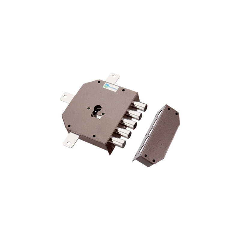 Per cilindro sagomato. Chiusura quintuplice con catenaccio a 5 pistoni e 2 mandate, corsa Mm. 29, predisposizione per fissaggio aste, corsa Mm. 17, e... Per cilindro sagomato. Chiusura quintuplice con catenaccio a 5 pistoni e 2 mandate, corsa Mm. 29, predisposizione per fissaggio aste, corsa Mm. 17, e deviatore. Scatola Mm. 132x146. In acciaio verniciato.
