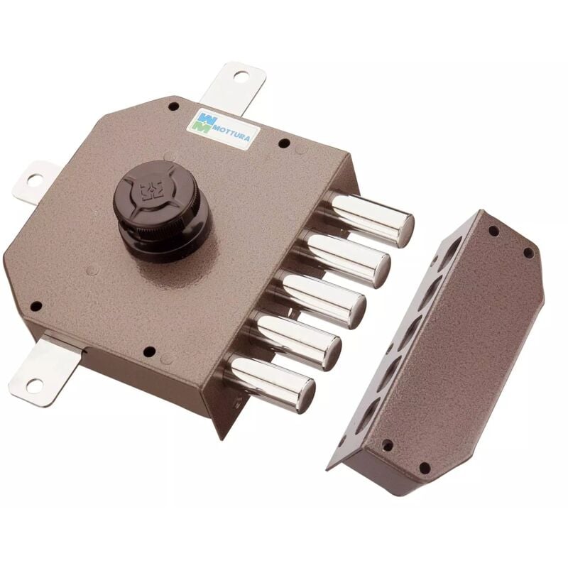 Serratura di sicurezza da applicare 30.641 DESTRA a chiave punzonata C28 PLUS. Chiusura quintuplice: 1 punto di chiusura composto da 5 chiavistelli con escursione di 40 mm, 1 punto di chiusura verso l'alto e 1 verso il basso entrambi con aste ed un' ulteriore aggancio per un deviatore che comanda altre due aste una alta e una bassa. Corsa aste 17 mm. Dimensioni scatola largh.132 mm. alt.146 spess.30 mm. Entrata chiave mm.63. Pompa-cilindro esterno lunghezza 50 mm e diametro 30 mm. Apertura interna tramite pomolo. Finitura: verniata marrone. La serratura viene fornita con ferrogliera, bocchetta esterna, pozzetto, cavallotto, 2 passanti per aste, viti/minuteria per il montaggio e tre chiavi punzonate C28 PLUS (duplicazione protetta)in busta sigillata. Info: la mano della serratura viene stabilita guardando lo schema nelle foto (la fotografia principale si riferisce alla versione DESTRA). La chiave C28 PLUS è duplicabile solamente presentando la carta di proprietà e nei centri MOTTURA