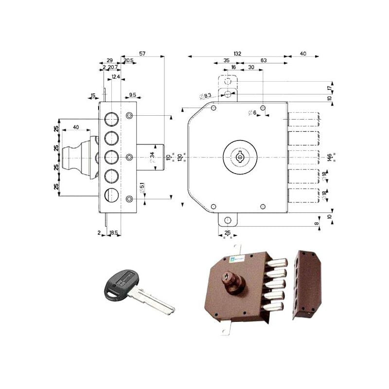 Serratura pompa applicare legno Doppia pompa esterna/interna 2 chiusure verticali Catenacci laterali 5 pistoni Misura scatola mm 132x146x30 - Entratamm 63 Diametro cilindro mm 34 lunghezza mm 50 Aste non incluse 3 chiavi C10