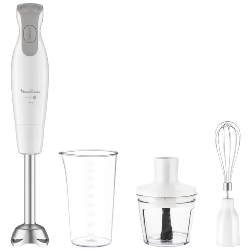 Il frullatore a immersione Moulinex Dailychef DD553110 offre prestazioni ottimali e un utilizzo semplice. Dispone di 4 lame in acciaio inossidabile con tecnologia Powelix, garantendo così prestazioni di miscelazione di lunga durata e risultati più veloci del 30%*. Grazie al suo potente motore da 600 W, garantisce prestazioni ottimali. Il frullatore a immersione è dotato di un'impugnatura ergonomica con un'unica manopola a doppia velocità altamente intuitiva, per soddisfare tutte le tue esigenze di miscelazione. Tipo di prodotto: frullatore a immersione. Potenza: 600W. Capacità della tazza (ml): 800 ml. Altri accessori inclusi: frusta, mini tritatutto, schiacciapatate, misurino da 800 ml. Colore bianco.