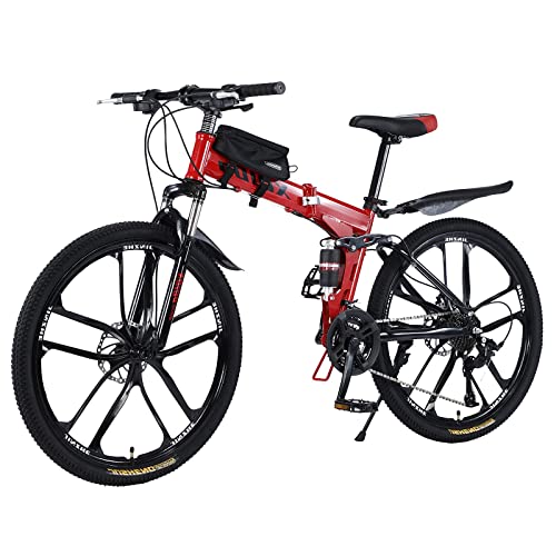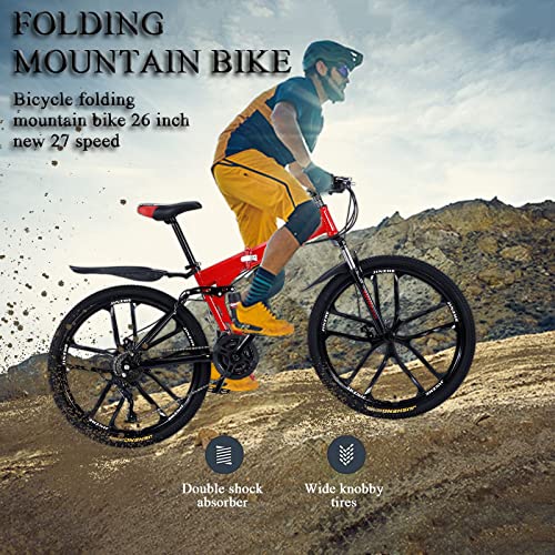 Mountain bike pieghevole da 26 pollici, con doppio assorbimento degli urti, telaio in fibra di carbonio con borsa per bicicletta, freni a disco, bici a sospensione completa perfetta (rosso)