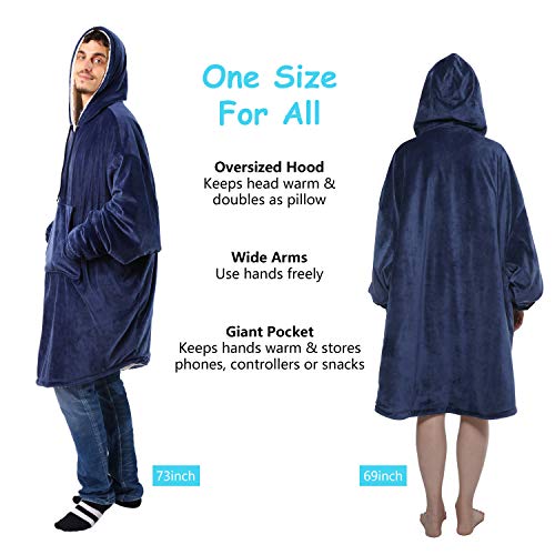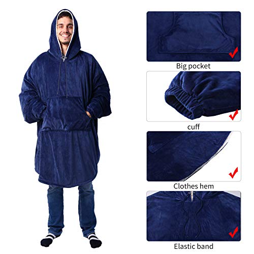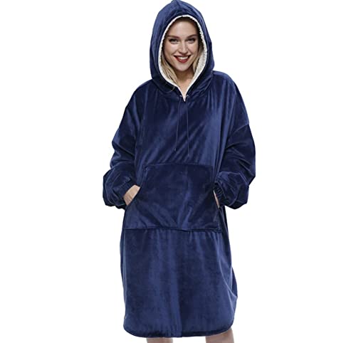Movaty Felpa Coperta Oversize, Reversibile Cappotto con Cappuccio Sherpa Copertina in Pile a Maniche Lunghe con Tasche Ideale per Adulti Donna Uomo (Blu)