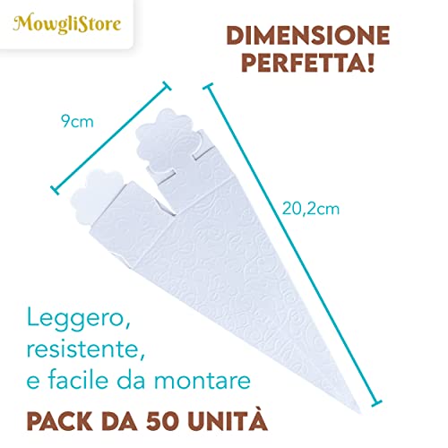 MowgliStore Coni Portariso Matrimonio Scatolina Confetti Bianco Bomboniere Battesimo Bambino Bambina 50 Pezzi Bianchi con Nastro Colorato Rosa Feste Baby Shower Confettata Rosa