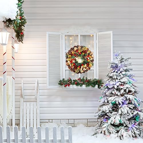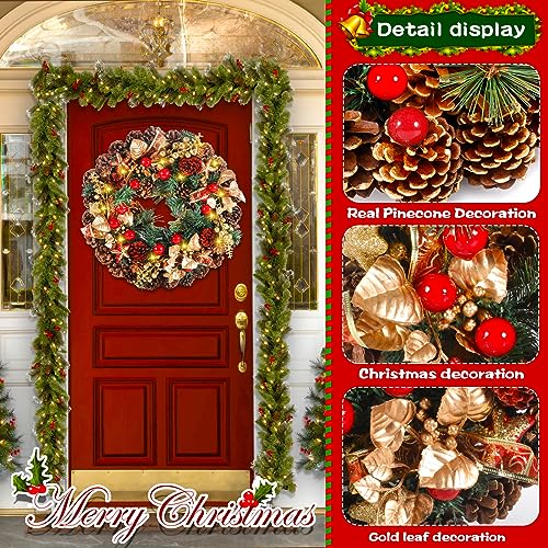 MOYKSRR Ghirlanda Natalizia per Porta 30cm, Corona di Natale, Decorazione Interno e Esterno, Con 20 Luci LED,Pigne,Bacche,Foglie Cadute