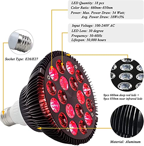 Lampada per terapia con luce rossa aggiornata: ogni lampadina per terapia ha 18 LED ad alta potenza in totale. 9 LED rossi profondi da 660 nm + 9 LED da 850 nm vicino a infrarossi che lo rendono la migliore lunghezza d'onda per la terapia della luce.