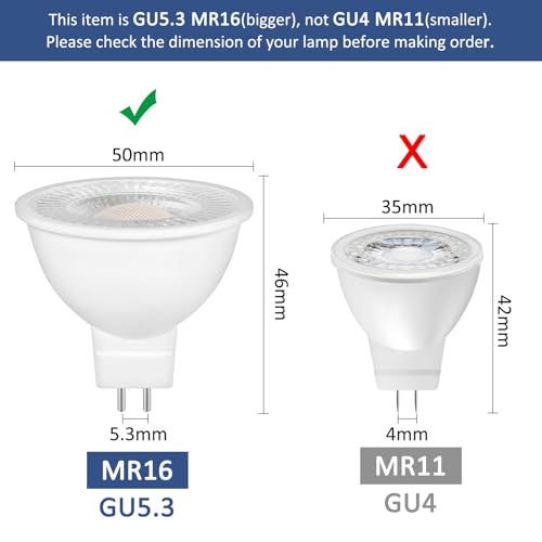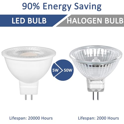 【Risparmio energetico del 90%】 Il LED GU5.3 da 5 W sostituisce la lampadina alogena da 50 W, brilla con la stessa luminosità e consente di risparmiare oltre il 90% dei costi dell'elettricità. La durata è fino a 25.000 ore, riducendo il fastidio e il costo della frequente sostituzione della lampada.