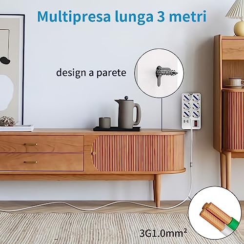 Mscien Ciabatta Multipresa con 3 USB (1 USB-C), 6 Prese, Multipresa Elettrica da Scrivania, Ciabatta Elettrica Presa con interruttore automatico di protezione 10A, 2500W, 3 metri Cavo