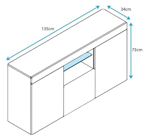 Dimensioni: Larghezza 135 cm x Altezza 73 cm x Profondità 34 cm. Le dimensioni ideali per il soggiorno o la sala da pranzo. Grande capacità, ideale per riporre ogni tipo di oggetto.