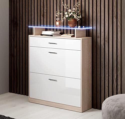 Modalità: Scarpiera da ingresso con due ante battenti, un cassetto e un ripiano in vetro illuminato con luce a LED. Ideale per mantenere l'ordine nell'ingresso di casa.