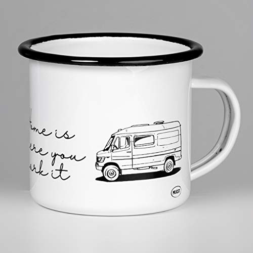 MUGSY - Tazza smaltata con scritta in inglese “Home is where you park it”, colore bianco, 300 ml, infrangibile, attrezzatura da campeggio