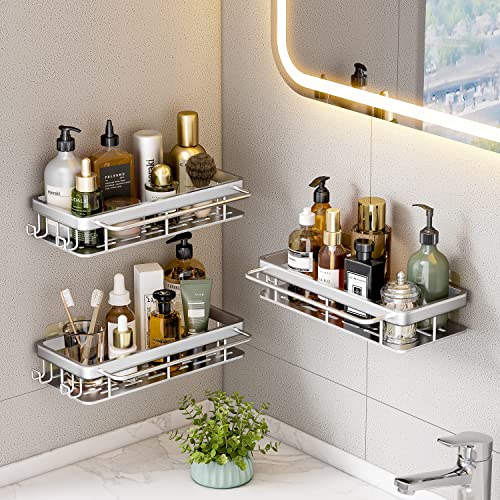 MUJUZE Mensola da doccia senza foratura, scaffale da bagno con gancio e porta asciugamani, design senza foratura, senza foratura, shampoo per il bagno e organizzazione (mensola per doccia argento)