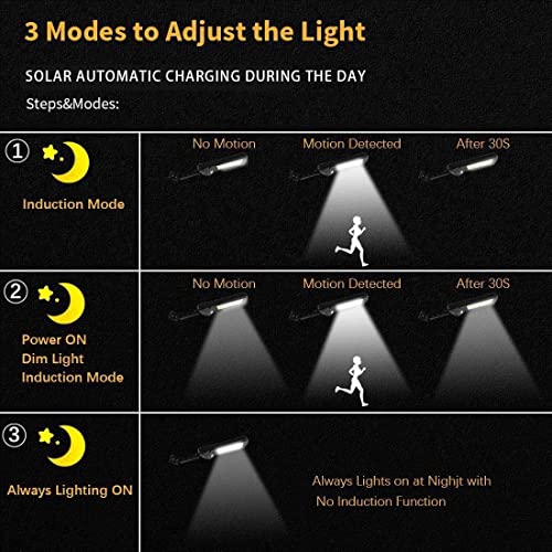 【SENSORE DI MOVIMENTO PIR】: - Questa lampada da parete solare di sicurezza per esterni assorbe la luce solare durante il giorno e si accende automaticamente di notte quando viene rilevato un movimento. La gamma del sensore di movimento da 5 a 7 metri con un angolo fino a 120 °. L'area di irradiazione è di 50 ² e l'illuminazione rimane accesa per circa 20 secondi, risparmiando energia e garantendo una durata più lunga rispetto ad altri prodotti simili sul mercato.