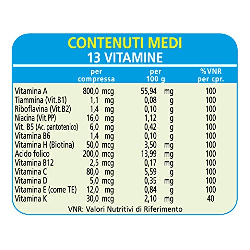 Formula: compresse rivestite per adulti fonte di vitamine e minerali, utili per colmare le carenze alimentari e apportare il giusto fabbisogno di nutrienti all'organismo