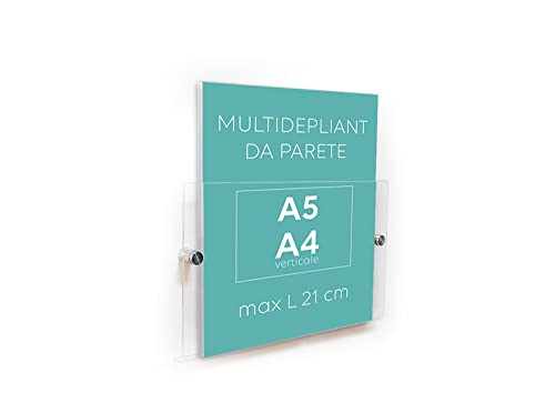 Multidepliant da parete in plexiglass formato A5 ed A4 verticale, per avvisi, annunci e volantini, completo di distanziali in alluminio spazzolato