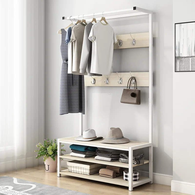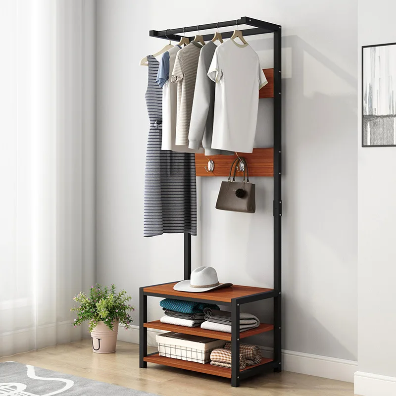 Multifunction Metal Wooden Coat Rack Floor Standing Wardrobe Clothes Hanging Storage Shelf Clothing Drying Racks with Back Hooks