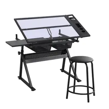 Multifunctional USA Warehouse Height Adjustable Glass Top Drafting Table with Storage Drawer Black