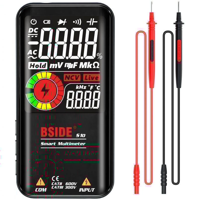 Schermo LCD EBTN: lo schermo LCD EBTN migliora notevolmente l'esperienza di lettura, i numeri e le lettere illuminati con sfondo nero lo rendono molto facile da leggere, anche alla luce diretta del sole o in condizioni di scarsa illuminazione. > 3 Risultato Display: ampio schermo ad alta risoluzione in grado di visualizzare 3 risultati di test sullo schermo, come tensione, frequenza e barra analogica. Identificazione automatica: l'identificazione automatica migliora notevolmente l'efficienza del test. La tecnologia intelligente BSIDE consente a questo multimetro di identificare automaticamente i parametri da testare e di scegliere l'intervallo richiesto. [Custodia protettiva]: custodia protettiva durevole per la protezione da urti, attriti e urti. Questa custodia è rimovibile e facile da sostituire. Torcia aggiornata: la torcia può cambiare l'ambiente buio.